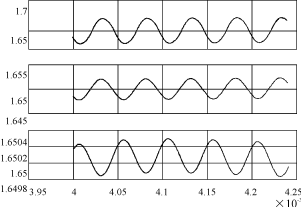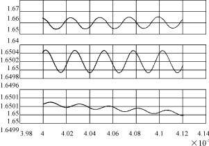 可見,當PWM頻率越低,DSP產生定時中斷所需的計數(shù)值越大,其量化誤差的影響越小。但是,考慮到輸出低通濾波器的特性,當PWM頻率降低時,產生的諧波頻率也隨之降低,則對于帶寬和截止頻率一定的濾波器來說,就會有更多的低次諧波通過濾波器,這部分諧波疊加在直流量上同樣會產生誤差電壓。因此,本文D/A轉換的誤差主要來源于這兩個方面,由于兩個誤差具有相互制約性,必須通過折中的方法選取一個合適的PWM載波頻率。表1(通過Matlab仿真)是選用不同的PWM頻率和不同階數(shù)的濾波器時的性能比較。仿真時采用截止頻率為2kHz的巴特沃茲濾波器。圖2是當PWM信號頻率為20kHz時,經不同階數(shù)濾波器后直流電壓的紋波比較,圖中從上到下依次是二階、三階、四階的濾波效果。圖3是PWM信號頻率為40kHz時,濾波后直流電壓的紋波,圖中從上到下依次為二階、三階、四階的濾波效果。