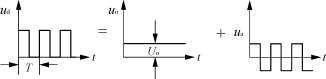 在F2407A型DSP中,通過軟件編程可以很方便地對PWM信號實現(xiàn)周期和占空比的控制。PWM信號是一組幅值為3.3V的方波,可以通過傅里葉變換,使其分成直流和交流兩部分,如圖1所示,其中ud(t)是輸出的PWM信號,Uo是PWM信號中的直流成分,ua(t)是信號中的交流成分。