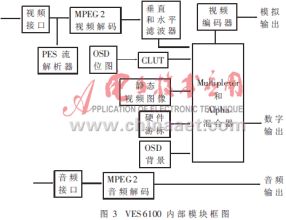 VES6100芯片是一種MPEG2解碼器,其內(nèi)部結(jié)構(gòu)框圖如圖3所示。