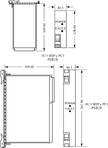 圖1給出了cPCI電源的機(jī)械結(jié)構(gòu)。通常,PCI系統(tǒng)中采用3U和6U機(jī)架。3U單元(128.6mm× 40.3mm×169.6mm)一般能提供大約200~250W的輸出功率,6U單元(261.9mm×40.3mm×169.6mm)一般要提供大約400~500W的輸出功率。