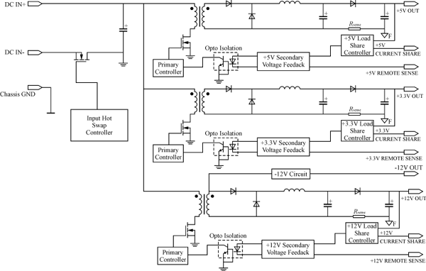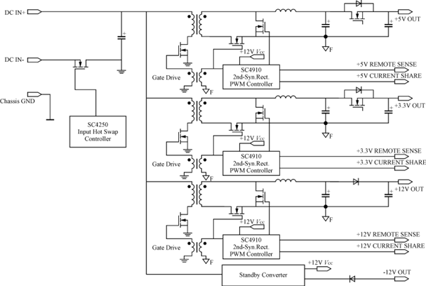 同步整流cPCI電源能夠在很大程度上降低功耗和提高效率。在相同的機(jī)架內(nèi),同步整流cPCI電源的功率是傳統(tǒng)非同步cPCI電源功率的2倍。SC4910能比較容易地實現(xiàn)同步整流,并且其均流功能滿足cPCI電源要求。