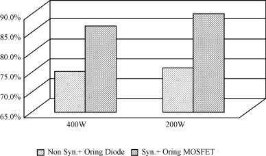 圖10是200W和400W二種電源的功耗和效率的對比圖。可以看出,400W的同步整流cPCI電源的功率損耗近似等于200W傳統(tǒng)二極管整流cPCI電源的功率損耗。因此,同樣是3U的機(jī)架,同步整流電源的輸出功率是傳統(tǒng)二極管整流電源輸出功率的兩倍。