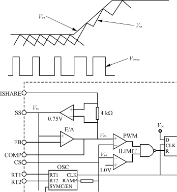 3)如果某一個+5V變換器(變換器1)的電流大于另一個+5V變換器(變換器2)的電流,變換器1的Vea將會大于變換器2的Vea。此時變換器1的Vss就會下降,從而降低它的Vea直到它等于變換器2的Vea。