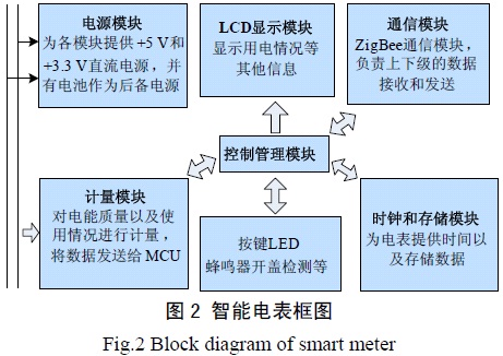 根據(jù)智能電表的各項功能,設(shè)計其結(jié)構(gòu)框圖,如圖2 所示。智能電表包含有控制管理、電源、計量、通信、時鐘、數(shù)據(jù)存儲、LCD、LED、按鍵等模塊。