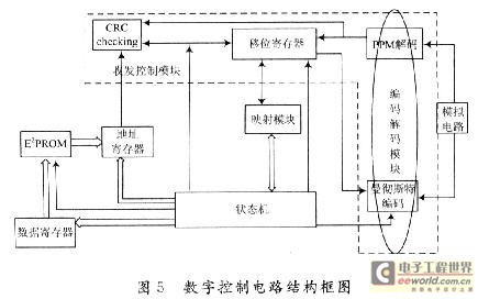 數(shù)字控制電路是整個(gè)芯片的重要的功能模塊,它接收來自射頻接口電路的解調(diào)后的信號以及13.56 MHz的時(shí)鐘信號.對解調(diào)信號解碼并進(jìn)行處理。在數(shù)字控制電路的控制下,對E2PROM進(jìn)行讀寫操作,并對返回?cái)?shù)據(jù)進(jìn)行編碼后送人射頻接口電路。數(shù)字控制電路系統(tǒng)由收發(fā)控制模塊(編解碼子模塊、CRC子模塊和移位寄存器)、映射模塊、狀態(tài)機(jī)等組成。整個(gè)數(shù)字控制電路結(jié)構(gòu)框圖如圖5所示。