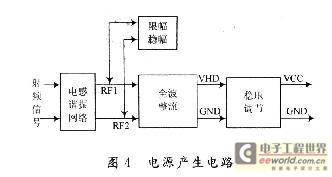 射頻接口電路包括電源產(chǎn)生電路、調(diào)制解調(diào)電路、時(shí)鐘產(chǎn)生電路和復(fù)位電路。結(jié)構(gòu)如圖3所示。
