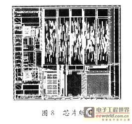 版圖設(shè)計(jì)主要包括模塊設(shè)計(jì)、芯片規(guī)劃、布局、布線等,是一個(gè)組合規(guī)劃和巧拼圖形的工作,是從邏輯信息向幾何信息的轉(zhuǎn)換。設(shè)計(jì)中采用SMIC0.35μmE2PROM CMOS工藝,E2PROM采用4個(gè)存儲單元。版圖規(guī)劃時(shí)要考慮好單元間的走線,降低布線難度,另外注意有特殊要求的單元模塊的處理,如把噪聲敏感的模塊隔離起來,版圖設(shè)計(jì)如圖8所示,左邊是射頻接口電路,左上和左下是儲能電容,右中上部分是數(shù)字控制電路,右中下部分是E2PROM電路。