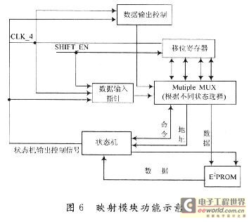映射模塊實(shí)質(zhì)上是一些特殊的數(shù)據(jù)通道,它將狀態(tài)機(jī)、收發(fā)移位寄存器以及存儲器分別對應(yīng)連接起來,實(shí)現(xiàn)數(shù)據(jù)和命令的分離。映射模塊功能示意如圖6所示。