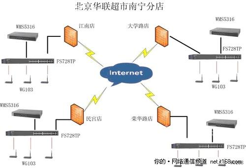 此次首先實(shí)施無(wú)線局域網(wǎng)絡(luò)信號(hào)覆蓋的是南寧所有華聯(lián)分店,共采用了NETGEAR WG103無(wú)線接入點(diǎn)86臺(tái) 和4臺(tái)WMS5316控制器. NETGEAR WG103無(wú)線訪問(wèn)點(diǎn)AP兼容802.11g, 802.11b無(wú)線設(shè)備,具有豐富的用戶安全認(rèn)證/數(shù)據(jù)加密的功能. 為應(yīng)超市盤點(diǎn)讀取產(chǎn)品條碼信息提供高速、穩(wěn)定的無(wú)線查詢和傳輸。網(wǎng)絡(luò)拓?fù)涫疽鈭D如下: