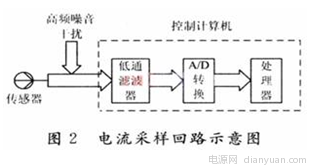 逆變器電路在工作時(shí)會(huì)產(chǎn)生許多高頻電流諧波,這些高頻諧波會(huì)產(chǎn)生高頻電磁場(chǎng),這些空間分布的高頻電磁場(chǎng)會(huì)在采樣電路中產(chǎn)生很多干擾,會(huì)在信號(hào)傳輸線路當(dāng)中產(chǎn)生很多電壓干擾信號(hào)。由于導(dǎo)線分布參數(shù)的復(fù)雜和非線性特征。這些干擾的電壓信號(hào)往往體現(xiàn)為噪音信號(hào),噪聲是不能夠被信號(hào)濾波器完整濾除的,通過(guò)低通濾波之后,其截止頻率以下的噪音信號(hào)任然保留,而這些噪音信號(hào)將參與整個(gè)系統(tǒng)的運(yùn)算,最終影響發(fā)出,使得有源電力濾波器的實(shí)際的效果大打折扣。電流采樣回路框圖如圖2所示。