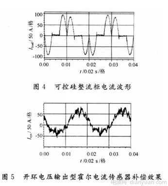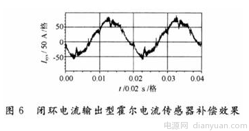 實(shí)驗(yàn)分別對(duì)開(kāi)環(huán)電壓輸出型霍爾電流型傳感器和閉環(huán)電流輸出型霍爾電流傳感器做比較分析,運(yùn)行樣機(jī),得出以下不同的補(bǔ)償效果。圖4為可控硅整流柜開(kāi)啟時(shí)的負(fù)載電流Iload。,其中橫坐標(biāo)為時(shí)間,單位為秒,縱坐標(biāo)為電流,單位為安培,可以看出該電流含有大量非基波成分,經(jīng)過(guò)專業(yè)儀器分析,該電流含有大量的5次和7次諧波,這也印證了可控硅電路的諧波含有特點(diǎn)。為樣機(jī)安裝電壓輸出型霍爾電流傳感器,測(cè)量Isys對(duì)可控硅整流柜的補(bǔ)償效果如圖5所示,可見(jiàn)結(jié)果中電流趨于正弦,但仍含有很多毛刺,經(jīng)過(guò)專業(yè)工具分析,發(fā)現(xiàn)電路中雖然5次和7次諧波明顯降低,但是出現(xiàn)了部分偶次諧波,而這些待補(bǔ)償電流中原來(lái)沒(méi)有,說(shuō)明這些電流是由有源濾波器發(fā)出的,而發(fā)出這些電流的原因歸咎于信號(hào)傳遞過(guò)程中的干擾,這些噪聲信號(hào)通過(guò)低通濾波器后仍然留有部分頻率較低信號(hào),參與運(yùn)算后得到了這樣的結(jié)果。