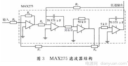 MAX275是美國(guó)MAXIM公司生產(chǎn)的通用型有源濾波器。它內(nèi)含兩個(gè)獨(dú)立的二階有源濾波電路,可分別同時(shí)進(jìn)行低通和帶通濾波,也可通過(guò)級(jí)聯(lián)實(shí)現(xiàn)四階有源濾波,中心頻率/截止頻率可達(dá)300 kHz。MAX275無(wú)需時(shí)鐘電路,因此與開(kāi)關(guān)電容濾波器相比,其噪聲更低,動(dòng)態(tài)特性更好,能廣泛應(yīng)用于各種精密測(cè)試設(shè)備、通信設(shè)備、醫(yī)療儀器和數(shù)據(jù)采集系統(tǒng)。
