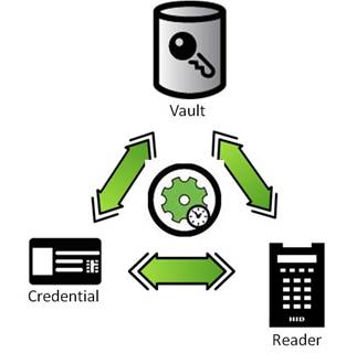 “安全庫”與端點設備之間的驗證通過后,該設備在網絡中就被視為是“可信的”??尚旁O備無需再與安全庫進行通信,可以獨立工作。在這種方式下,各端點(如憑證卡及讀卡器)之間的信息傳輸是“可信的”,而由此產生的信息傳輸(例如打開一道門或登錄到計算機)也就被視為是“可信的”。