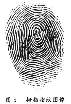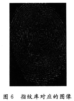 采用The MathWorks公司的Matlab 7.0圖像處理箱進(jìn)行數(shù)據(jù)仿真,計算機(jī)配置CPU為Intel公司3.06 GZH,內(nèi)存為Kingston公司的2GZH,平均一幅圖像數(shù)據(jù)仿真耗時為0.53 s,識別率誤差小于1/310 000,完全實際符合要求。圖5為隨機(jī)的一幅拇指指紋圖像,圖6為指紋庫采集對應(yīng)的圖像。