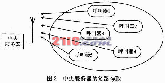對無線呼叫系統(tǒng)來說,中央服務(wù)器與呼叫器之間只存在很短的動作周期,這種周期被較長的不等非工作間歇所中斷。呼叫器發(fā)出的數(shù)據(jù)在數(shù)十ms的時間內(nèi)被鑒別,讀出和寫入;接著,中央服務(wù)器在較長的時間內(nèi)不會上到呼叫器發(fā)出的信號。但這并不意味我們不需要考慮多個呼叫器同時向服務(wù)器傳輸數(shù)據(jù)的可能性。我們需要的是一種高效的多路存取法,使用戶感覺不到時間的損失就完成了數(shù)據(jù)的區(qū)分、顯示及對用戶的響應(yīng)。見圖2,許多呼叫器試圖“圖時”將數(shù)據(jù)傳輸給服務(wù)器。