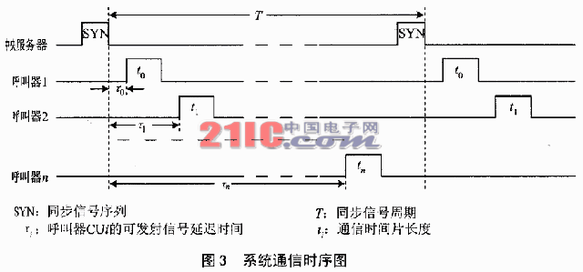 系統(tǒng)由中央服務(wù)器產(chǎn)生的步信號作為整個系統(tǒng)同步的基準(zhǔn)信號,這就為所有呼叫器建立了一個能夠計算出各自可以發(fā)出呼叫申請時間的起點。這里的同步信號是使整個系統(tǒng)協(xié)調(diào)工作的同步信號,而并不要求單個呼叫器與中央服務(wù)器采用同步通信方式的幀同步信號,呼叫器與央服務(wù)器之間的通信仍然可以采用異步通信的方式。呼叫器從收到系統(tǒng)同步信號后,開始計算可以發(fā)送信號的延遲時間。延遲時間的長度是在系統(tǒng)設(shè)計時就已經(jīng)約定的,每臺呼叫器對應(yīng)不同的延遲時間,使各個呼叫器與服務(wù)器通信的時間是錯開的,不會產(chǎn)生重疊,也就防止了中央服務(wù)器時收到多臺呼叫器的服務(wù)申請,避免了數(shù)據(jù)之間的碰撞。中央服務(wù)器產(chǎn)生的系統(tǒng)同步信號是周期性的,這個周期的大小與系統(tǒng)中呼叫器的個數(shù)、呼叫器與服務(wù)器之間完成一次通信所需要的時間有關(guān),也與硬件設(shè)計的系統(tǒng)時鐘大小和數(shù)據(jù)傳輸?shù)牟ㄌ芈视嘘P(guān)。圖3給出了中央服務(wù)器與呼叫器之間通信的時序圖。