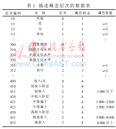 為了將概念層次樹存入數(shù)據(jù)庫,在表1中列出了描述概念層次的數(shù)據(jù)表。將概念層次樹中的屬性信息映射到數(shù)據(jù)庫表中,表中給出了層次編碼、概念節(jié)點的名稱、層號、屬性標(biāo)志和與概念相對應(yīng)的屬性取值的區(qū)間。概念層次樹中葉節(jié)點為第0層,葉節(jié)點的父概念所在節(jié)點為第1層,以此向上類推。如果概念層次樹是兩層,在數(shù)據(jù)表中層次編碼用兩位數(shù)字;如果是三層的,編碼用三位數(shù)字。性別的屬性標(biāo)志是1,年齡的屬性標(biāo)志是2,教育程度的屬性標(biāo)志是3,收入的屬性標(biāo)志是4,以此類推。