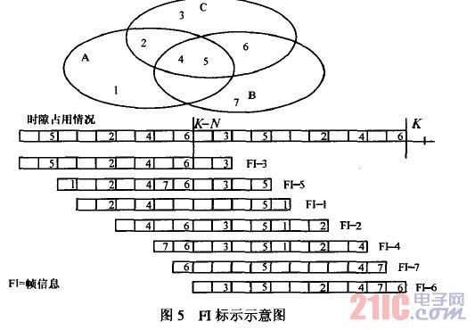 ?、?通過(guò)每幀周期廣播幀信息(FI,frame information),使所有的鄰節(jié)點(diǎn)都知道每一個(gè)時(shí)隙的信道使用狀況,從而使RR—AL OHA協(xié)議能夠在車載自組網(wǎng)中正確運(yùn)行。FI是發(fā)送節(jié)點(diǎn)感知的前一幀的時(shí)隙狀態(tài)信息。RR—AL OHA 可以在不同的物理層標(biāo)準(zhǔn)下使用,尤其適合采用時(shí)隙結(jié)構(gòu)的物理層。當(dāng)有節(jié)點(diǎn)加入時(shí),先偵聽一幀的時(shí)間,然后選擇一個(gè)空閑時(shí)隙發(fā)送一個(gè)分組,來(lái)預(yù)約這個(gè)時(shí)隙。如果鄰節(jié)點(diǎn)正確接收到了該分組,則在它的FI中標(biāo)示出來(lái)。當(dāng)新加入的節(jié)點(diǎn)從一幀時(shí)間內(nèi)收到的所有FI中知道鄰節(jié)點(diǎn)都正確接受到分組時(shí),即認(rèn)為預(yù)約成功,從而將每幀的該時(shí)隙作為它的基本信道(BC,base channe1),直到節(jié)點(diǎn)離開網(wǎng)絡(luò),在這期間其他節(jié)點(diǎn)不能訪問(wèn)該時(shí)隙。其中,BC 信道用于傳送FI、其他信令信息和承載有效載荷。在每一幀中,節(jié)點(diǎn)都必須在自己的BC中發(fā)送FI信息,并根據(jù)鄰節(jié)點(diǎn)的FI和自己的信道使用情況及時(shí)更新FI信息。當(dāng)BC信道提供的帶寬不能滿足業(yè)務(wù)的要求時(shí),節(jié)點(diǎn)可以通過(guò)預(yù)約附加信道的方式占用其他空閑信道,以滿足業(yè)務(wù)要求。如果是點(diǎn)對(duì)點(diǎn)通信,節(jié)點(diǎn)還可以預(yù)約點(diǎn)對(duì)點(diǎn)(P2P,point—to—point)信道進(jìn)行傳送,以實(shí)現(xiàn)相鄰一跳群中的時(shí)隙復(fù)用,提高信道的利用率。圖5顯示了節(jié)點(diǎn)交換FI信息的示例。