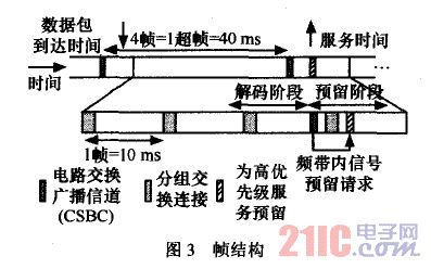 為了避免在隨機(jī)信道接入機(jī)制下的保留請(qǐng)求沖突,一種電路交換廣播連接(CSBC,circuit.switched broadcast channe1)被引入,它主要用來(lái)作為信令目的。如果在幀中沒有足夠的容量來(lái)支撐數(shù)據(jù)的發(fā)送,節(jié)點(diǎn)就可以利用CSBC來(lái)發(fā)送額外容量保留請(qǐng)求,如圖3所示。