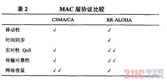 不過(guò)對(duì)于車載自組網(wǎng)的特殊性,預(yù)約式的同步MAC協(xié)議效果可能更好些。表2對(duì)CSMA/CA 和RR—ALOHA 這兩種MAC協(xié)議進(jìn)行了簡(jiǎn)單的比較。