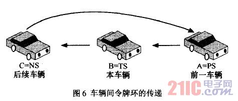 除了基于CSMA/CA和時(shí)隙類的MAC協(xié)議外,還有一些其他類型的MAC協(xié)議,如令牌環(huán)。在具備GPS系統(tǒng)的車輛問(wèn)可以使用基于非競(jìng)爭(zhēng)性的令牌環(huán)接入方式(如WTRP協(xié)議),以提高信道利用率,避免信道沖突,更能滿足車輛間安全預(yù)警通信的時(shí)延要求。在車載自組網(wǎng)中應(yīng)用令牌環(huán)的主要思想:在廣播信道上通過(guò)令牌組成邏輯環(huán)來(lái)控制信道的接入,為表述方便,稱本車輛(對(duì)應(yīng)通信網(wǎng)絡(luò)中的本地節(jié)點(diǎn))為TS(this station);前一車輛(對(duì)應(yīng)通信網(wǎng)絡(luò)中的上一節(jié)點(diǎn))為PS(previous station);后續(xù)車輛(對(duì)應(yīng)通信網(wǎng)絡(luò)中的后續(xù)節(jié)點(diǎn))稱為NS(next smtion)??紤]實(shí)際車輛隊(duì)列中,設(shè)車輛A,B,C構(gòu)成隊(duì)列,隊(duì)列內(nèi)采用無(wú)線令牌環(huán)協(xié)議,三輛車組成邏輯令牌環(huán),令牌傳遞順序?yàn)锳—B—C—A。設(shè)某一時(shí)刻B為令牌擁有者,令B為TS,相應(yīng)的A為PS,C為NS。網(wǎng)絡(luò)結(jié)構(gòu)示意如圖6所示,圖中箭頭方向表示令牌傳遞方向,當(dāng)車輛持有令牌后才能開始進(jìn)行數(shù)據(jù)的發(fā)送,而那些沒有持有令牌的車輛只能進(jìn)行數(shù)據(jù)的接受。當(dāng)傳送完一定的數(shù)據(jù)后,令牌擁有者把令牌傳遞給后續(xù)車輛,開始下一輛車的數(shù)據(jù)傳送。