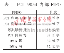 PCI 9054內(nèi)部有6種可編程的FIFO,其長度如表1所示,以實(shí)現(xiàn)零等待突發(fā)傳輸及本地總線和PCI總線之間的異步操作。
