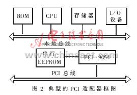 利用PCI 9054芯片構(gòu)成的PCI適配器典型框圖如圖2所示。