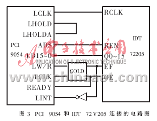 IDT72205是容量為256×18bit的高速、低功耗同步/異步FIFO存儲器,具有獨(dú)立的收、發(fā)時鐘控制,將之掛于PCI 9054的本地總線可以實(shí)現(xiàn)PCI 9054 FIFO 的擴(kuò)充。圖3為PCI 9054和IDT 72205連接的電路圖。
