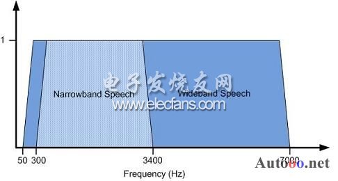 傳統(tǒng)電話系統(tǒng)的帶寬被限制在大約300Hz到3.4kHz的音頻頻率范圍內(nèi)(圖表1),這一范圍通常被稱為窄帶語音。盡管現(xiàn)在的電話系統(tǒng)是數(shù)字式的,但其還是傳承了與傳統(tǒng)模擬系統(tǒng)相同的帶寬。從語音質(zhì)量的角度來看,窄帶語音缺乏自然語音保真度,常常被形容為單薄和模糊不清。盡管如此,窄帶頻率范圍內(nèi)完整語句的語音辨別度大概是99%。
