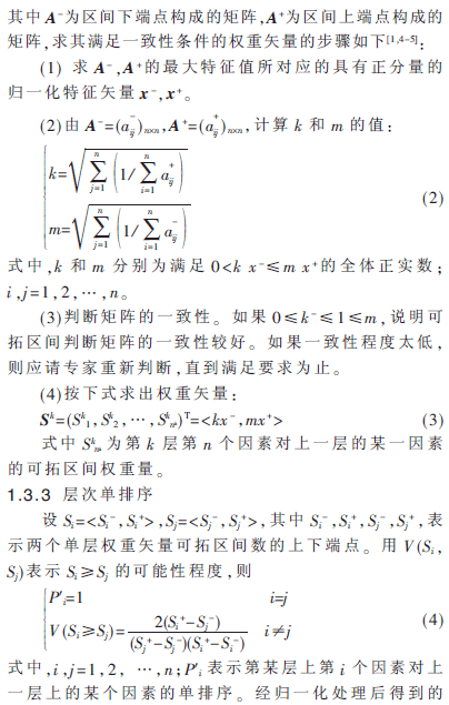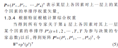 由群組決策特征根法[2]可知,Wk的最大特征根對(duì)應(yīng)的特征向量即是最優(yōu)決策結(jié)論,也即綜合了所有專家判斷的關(guān)于第k層上全體因素對(duì)其上一層某因素的綜合單排序。將Wk歸一化處理之后,即可得到第k層上各因素對(duì)其上一層某因素的權(quán)重。