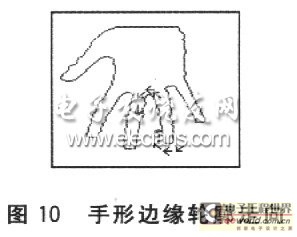 再分析手的形狀,兩手指之間邊緣輪廓的走向也滿足判斷條件l,故必須添加判斷條件。如圖10所示,當(dāng)沿著一個(gè)方向搜索手的邊緣輪廓時(shí),經(jīng)過指尖走向一定與手指間缺口走向相反。因此,必須假設(shè)判定條件2: