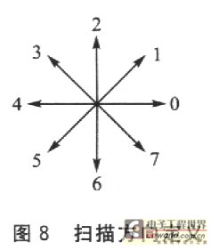 ?、侔磸纳系较?、從左到右的順序掃描圖像,尋找第一個(gè)非白像素作為邊界起始點(diǎn)A[0],記錄A[0]點(diǎn)的坐標(biāo)(A[0].x,A[0].y)。A[0]是具有最小行和列值的邊界點(diǎn)。再定義一個(gè)掃描方向變量dir,該變量用于記錄上一步中沿著前一個(gè)邊界點(diǎn)到當(dāng)前邊界點(diǎn)的移動(dòng)方向。其初始化取值為A[0].dir=7;掃描方向定義如圖8所示。
