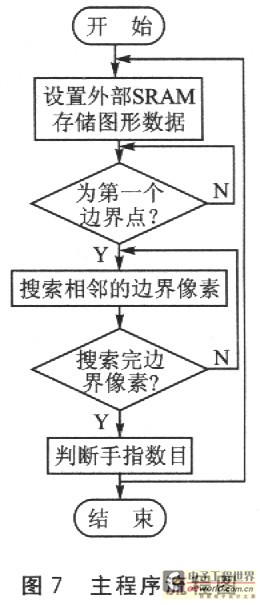 輪廓跟蹤的目的是獲得圖像的外部輪廓特征(包括目標(biāo)物體邊緣點(diǎn)的坐標(biāo)和方向),為圖像的形狀分析做準(zhǔn)備。SPCA563B的DSP針對(duì)膚色有一系列的顏色處理,這樣系統(tǒng)就可以方便圖像轉(zhuǎn)化為膚色與非膚色的二值圖像。通過對(duì)暫存在SRAM中的二值圖像進(jìn)行數(shù)據(jù)分析,來提取手形的邊緣輪廓。