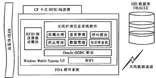系統(tǒng)運行環(huán)境為WindowsMobileSvstem5.0,PDA上安裝CF卡式RFID閱讀器,通過驅(qū)動程序?qū)?biāo)簽上的數(shù)據(jù)傳送給護理信息系統(tǒng),實現(xiàn)患者和藥品的唯一性確認(rèn)。護理信息系統(tǒng)通過0racle0DBC驅(qū)動程序連接HlS數(shù)據(jù)庫,實現(xiàn)數(shù)據(jù)交互,鏈路層上通過無線網(wǎng)絡(luò)實現(xiàn)。