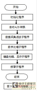 軟件采用模塊化設(shè)計。全部軟件由主程序、鍵盤處理子程序、數(shù)據(jù)采集子程序、報警程序組成。主程序是控制和管理的核心。系統(tǒng)上電后進行初始化和中斷處理操作。初始化主要完成對報警值的設(shè)定和初次檢查,同時斷開各電器的電源。初始化完成后,系統(tǒng)開始正常運轉(zhuǎn)。進行甲醛濃度檢測和報警等操作,主程序的流程圖如圖3所示。