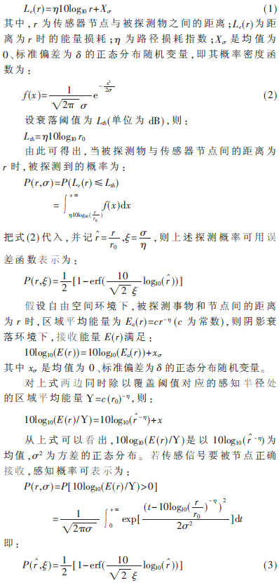 自由空間環(huán)境下其能量損耗僅與信號的傳播距離有關,稱為基本損耗[4]。但是,在基于電波傳感的網(wǎng)絡中,信號在傳輸過程中會不可避免地遇到各種障礙物阻擋和其他電波的干擾,產(chǎn)生繞射現(xiàn)象,使信號強度繞中值上下波動,形成陰影衰落。此時,能量損耗為基本損耗與隨機變量之和,且隨機變量服從對數(shù)正態(tài)分布,滿足[4]:
