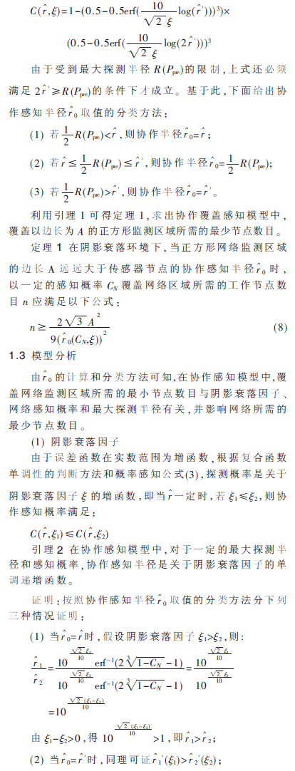 本文針對陰影衰落環(huán)境下無線傳感器網(wǎng)絡的覆蓋問題,采用正三角形結構的部署節(jié)點,利用了單個節(jié)點的概率探測和多個節(jié)點間的協(xié)作探測特性,充分考慮陰影衰落因子、網(wǎng)絡感知概率、覆蓋精度對無線傳感器網(wǎng)絡覆蓋的影響,提出了基于概率的協(xié)作感知覆蓋模型,并推導出滿足一定覆蓋質量要求的協(xié)作感知半徑和最少工作節(jié)點數(shù)目的計算公式。經(jīng)分析和實驗仿真可知,陰影衰落因子的增大,網(wǎng)絡感知概率或覆蓋精度的減小,都會導致協(xié)作感知半徑的增大,從而減少最少工作節(jié)點數(shù)目,延長網(wǎng)絡壽命。