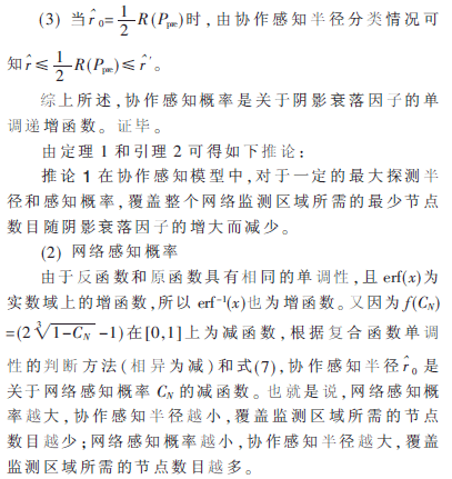 從協(xié)作感知半徑取值的分類方法可以看出,當陰影衰落因子一定時,減小覆蓋精度,則最大探測半徑增多,使得網(wǎng)絡中感知概率最小的點有可能被更多的節(jié)點感知,從而增大協(xié)作感知概率,即增大了網(wǎng)絡感知概率。反之當網(wǎng)絡感知概率一定時,隨著覆蓋精度的減小,協(xié)作感知半徑增大,覆蓋網(wǎng)絡監(jiān)測區(qū)域所需的最少節(jié)點數(shù)目減少。