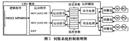 運(yùn)動(dòng)控制單元內(nèi)部有三類參數(shù):固定參數(shù)、設(shè)定參數(shù)和監(jiān)控參數(shù)。其中固定參數(shù)包括電機(jī)參數(shù)、伺服驅(qū)動(dòng)器參數(shù)、編碼器參數(shù)等固定數(shù)據(jù);設(shè)定參數(shù)用來向伺服驅(qū)動(dòng)器提供伺服控制命令,在系統(tǒng)運(yùn)行時(shí)可以實(shí)時(shí)更改;監(jiān)控參數(shù)由與伺服馬達(dá)相連的編碼器反饋到運(yùn)動(dòng)控制單元的電機(jī)運(yùn)動(dòng)狀態(tài)數(shù)據(jù),這些監(jiān)控?cái)?shù)據(jù)可以在運(yùn)動(dòng)程序和邏輯程序中作為參考。CPU單元對(duì)運(yùn)動(dòng)控制單元的控制是通過其I/O端口與運(yùn)動(dòng)控制單元的參數(shù)相互對(duì)應(yīng)建立的。為建立這種聯(lián)系,須將CPU單元的輸出I/O端口分配給運(yùn)動(dòng)單元的設(shè)定參數(shù),輸入I/O端口分配給運(yùn)動(dòng)單元的監(jiān)控參數(shù)。CPU單元在進(jìn)行I/O刷新時(shí)將監(jiān)控參數(shù)讀入內(nèi)存,同時(shí)將伺服控制命令寫入到運(yùn)動(dòng)控制單元的設(shè)定參數(shù)中,實(shí)現(xiàn)對(duì)運(yùn)動(dòng)控制單元的控制。伺服系統(tǒng)的控制原理如圖2所示。