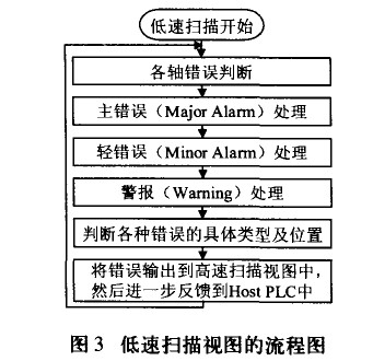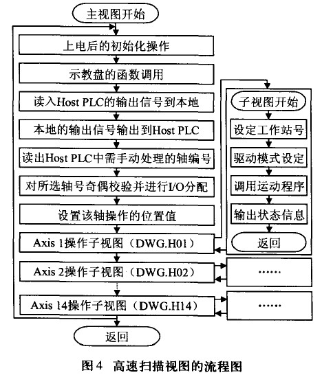 伺服系統(tǒng)控制程序采用模塊化編程,各自針對(duì)要求不同的應(yīng)用設(shè)計(jì)了高速掃描視圖、低速掃描視圖和運(yùn)動(dòng)控制程序。系統(tǒng)上電之后,CPU就同時(shí)開始高速掃描與低速掃描兩個(gè)獨(dú)立的掃描過程,并在高速掃描過程中調(diào)用運(yùn)動(dòng)程序來進(jìn)行運(yùn)動(dòng)控制。低速和高速掃描視圖的流程分別如圖3和圖4所示。