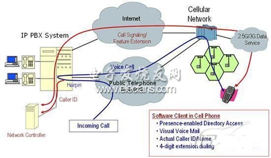 同時(shí)振鈴方案的一個(gè)重要功能是支持所有手機(jī),而不需要Wi-Fi雙模手機(jī)或蜂窩電話,并且在任何移動(dòng)通信服務(wù)上都可以運(yùn)行。但這種方案也有兩個(gè)問(wèn)題:首先,處理所有出入站電話很可能會(huì)加大PBX的工作量;其次,不能確保用戶會(huì)接聽(tīng)桌面有線電話,因此,會(huì)導(dǎo)致移動(dòng)電話的用量。