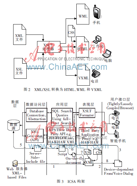 本文提出的ICSA(Interactive Customer Service Agent)構(gòu)架的處理流程如圖3下方所示。當(dāng)客戶通過撥電話號(hào)碼或鍵入U(xiǎn)RL連接到應(yīng)用系統(tǒng)時(shí),Web服務(wù)器上索引文件被傳遞。在執(zhí)行期間,客戶端或連接設(shè)備的頭部請(qǐng)求決定使用哪個(gè)XSL文件將選擇出的XML文件轉(zhuǎn)換成HTML表單、WML表單或Voice對(duì)話。在提交過程中,腳本查詢數(shù)據(jù)庫,并產(chǎn)生一個(gè)XML中間文檔,該XML文檔由一個(gè)XSL文件轉(zhuǎn)換,在Web瀏覽器下、將響應(yīng)表現(xiàn)給客戶之前,可選用CSS文件將其格式化。