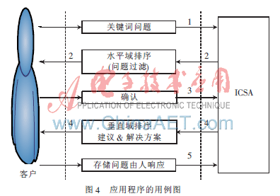 圖4所示為用例圖,明確地指出回答ICSA查詢涉及的五個(gè)步驟。在問題提交過程中,代理程序過濾關(guān)鍵詞,查詢數(shù)據(jù)庫,為客戶列舉類似問題,從而讓客戶選擇出與其問題最為類似的問題,進(jìn)而提交關(guān)鍵詞(稱為水平域排序的過程)。一個(gè)確認(rèn)消息等待客戶發(fā)出,這要么通過客戶點(diǎn)擊超鏈接(即最為類似的問題)實(shí)現(xiàn),要么通過語音響應(yīng)[7]實(shí)現(xiàn)。然后再執(zhí)行一個(gè)完全搜索(稱為垂直域排序),最后給出最適合的回答。如果在數(shù)據(jù)庫中不存在回答,將問題存儲(chǔ)起來需要由人響應(yīng)。