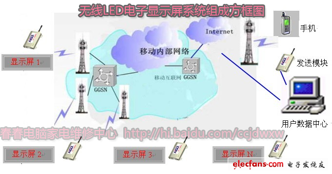 本系統(tǒng)主要由帶無線(GSM )數(shù)傳模塊的LED顯示屏、用戶數(shù)據(jù)發(fā)布中心(信息管理控制軟件+專用發(fā)送模塊)組成。