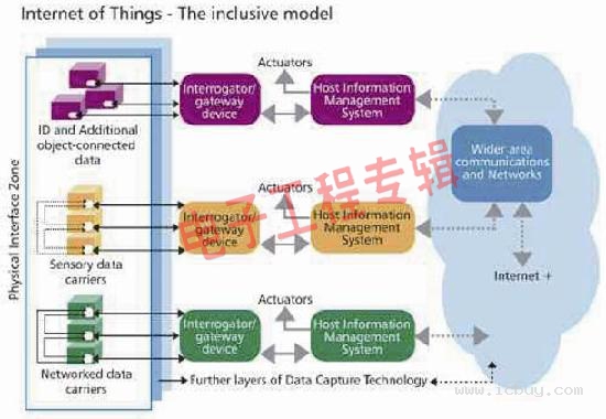 這些層級(jí)包含物理層、詢問器/網(wǎng)關(guān)器層、信息管理應(yīng)用與企業(yè)層以及更廣的通訊與因特網(wǎng)層(如圖1)。