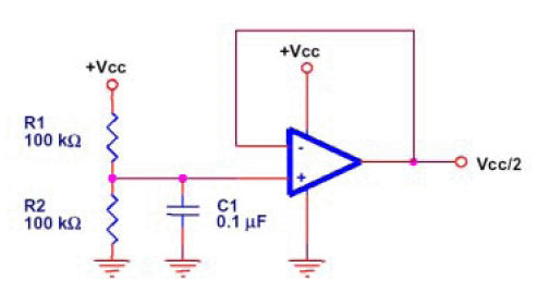 ??? 單電源工作的運放需要外部提供一個虛地,通常情況下,這個電壓是VCC/2,圖二的電路可以用來產(chǎn)生VCC/2的電壓,但是他會降低系統(tǒng)的低頻特性。