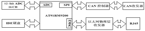 在處理器豐富資源的基礎(chǔ)上,本裝置對(duì)其進(jìn)行了相關(guān)的配置和擴(kuò)展,將處理器通過(guò)16路12位ADC接口對(duì)機(jī)電設(shè)備的電壓或電流信號(hào)進(jìn)行采集,IDE接口外掛大容量IDE硬盤(pán),用于存儲(chǔ)web、采集的數(shù)據(jù)等。通過(guò)DM9161芯片,該微處理器把EMAC接口外擴(kuò)為以太網(wǎng)接口RJ45,與工業(yè)以太網(wǎng)連接 [4]。AT91RM9200通過(guò)SPI接口連接CAN控制器SJA1000,CAN控制器與CAN收發(fā)器PCA82C250相連,用于連接 DeviceNet。硬件結(jié)構(gòu)如圖2所示: