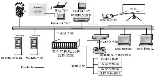 傳統(tǒng)的狀態(tài)監(jiān)測(cè)與故障診斷裝置通常采用現(xiàn)場(chǎng)總線方式,但此方式具有很大局限性:現(xiàn)場(chǎng)總線類(lèi)型多樣,相互之間差異較大,不能實(shí)現(xiàn)互操作,彼此連接困難,系統(tǒng)的信息共享和實(shí)時(shí)性不盡如人意。為了更好地搭起終端設(shè)備和遠(yuǎn)程監(jiān)控系統(tǒng)通信的橋梁,本文提出并設(shè)計(jì)了基于工業(yè)以太網(wǎng)的嵌入式狀態(tài)監(jiān)測(cè)與故障診斷裝置,和傳統(tǒng)裝置相比,它有以下優(yōu)勢(shì):實(shí)現(xiàn)了系統(tǒng)的高效、統(tǒng)一;用戶(hù)可以通過(guò)Internet隨時(shí)隨地監(jiān)控大范圍的終端設(shè)備,取代了大量前置PC,具有更好的實(shí)時(shí)、實(shí)效性[1,2]。本裝置將現(xiàn)場(chǎng)采集到的實(shí)時(shí)數(shù)據(jù)通過(guò)以太網(wǎng)直接傳送到內(nèi)嵌的Web服務(wù)器上,服務(wù)器生成用于遠(yuǎn)程監(jiān)測(cè)和遠(yuǎn)程故障診斷的web頁(yè)面,用戶(hù)通過(guò)鍵入設(shè)備的IP地址,就可以隨時(shí)瀏覽到被監(jiān)測(cè)設(shè)備的現(xiàn)場(chǎng)運(yùn)行情況、數(shù)據(jù)采集信息以及報(bào)警信息等。