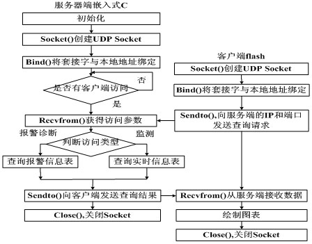 服務(wù)器端為嵌入式ARM,只能運(yùn)行基于TCP/IP協(xié)議的ARM-GCC編譯的Linux下的C++服務(wù)程序,本文使用嵌入式C++實(shí)現(xiàn)的 UDP socket技術(shù)與客戶(hù)端通信??蛻?hù)端使用flash或Java Applet和服務(wù)程序通信,提供動(dòng)態(tài)網(wǎng)頁(yè)。本文使用flash完成動(dòng)態(tài)刷新,動(dòng)態(tài)刷新采用線程機(jī)制,后臺(tái)數(shù)據(jù)通過(guò)UDP socket技術(shù)與服務(wù)器端通信來(lái)獲取。