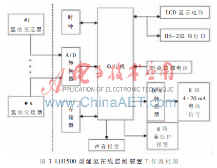 LH1500漏氫在線監(jiān)測裝置主要由主機、電纜和采樣頭三部分構成。裝置采用納米管束采樣頭,常規(guī)配制8點檢測,可擴展至14點。裝置主機主要由單片機、存儲器、時鐘電路、顯示電路、鍵盤掃描電路、報警控制電路等部分組成。整套裝置的工作原理(具體如圖3所示)為:采樣頭將待測環(huán)境氫氣濃度信號轉化為工業(yè)標準的4~20 mA電流信號遠傳到主機,經(jīng)主機中的A/D轉換器轉換為數(shù)字信號送給單片機;單片機將各路數(shù)據(jù)處理后顯示在彩色LCD屏上,并顯示量程、高低位報警值、日期等相關信息;同時單片機將處理后的數(shù)據(jù)通過D/A轉換器轉換為4~20 mA電流信號輸出;另外單片機還可根據(jù)各點的氫氣濃度及其報警限值發(fā)出高低位報警信號;系統(tǒng)預留1個與機組DCS系統(tǒng)通信的RS-232/485串行口。